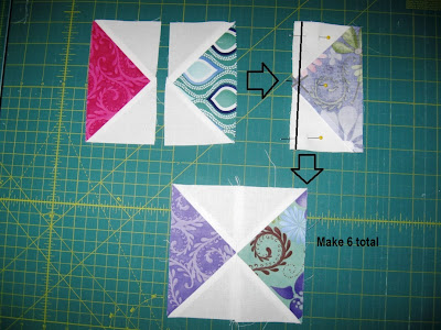 Now, grab your 12 sets of 4 flying geese you just made and 12 leftover sets of 2 and lay them out as follows. (Really pay attention to the directional orientation; I had to do some unpicking when I was only half focusing on what I was doing :) Lay the 2 flying geese onto the 4 with right sides together. Take care to match up the center seam of the 2 with the point of the 4th goose :) Pin along the seam and the edges. Chain stitch a 1/4" seam along the pinned edges, clip your threads, and press. These will be your top and bottom rows and you can set these aside for a minute.
