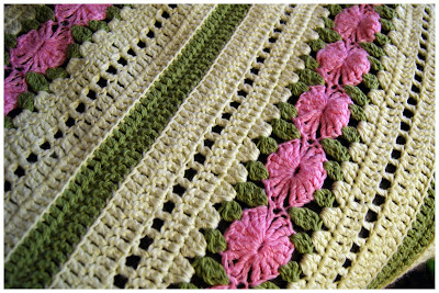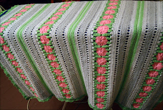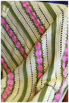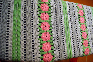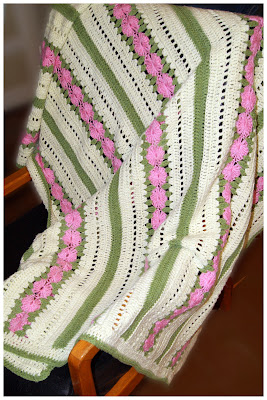 из 4-х полос. Размер больше чем в описании. Для цветочков набирала 214 воздушных петель. немного изменила порядок выполнения столбиков на основном полотне, чтобы они были более широкими. Размер пледа 140 х 175 см.