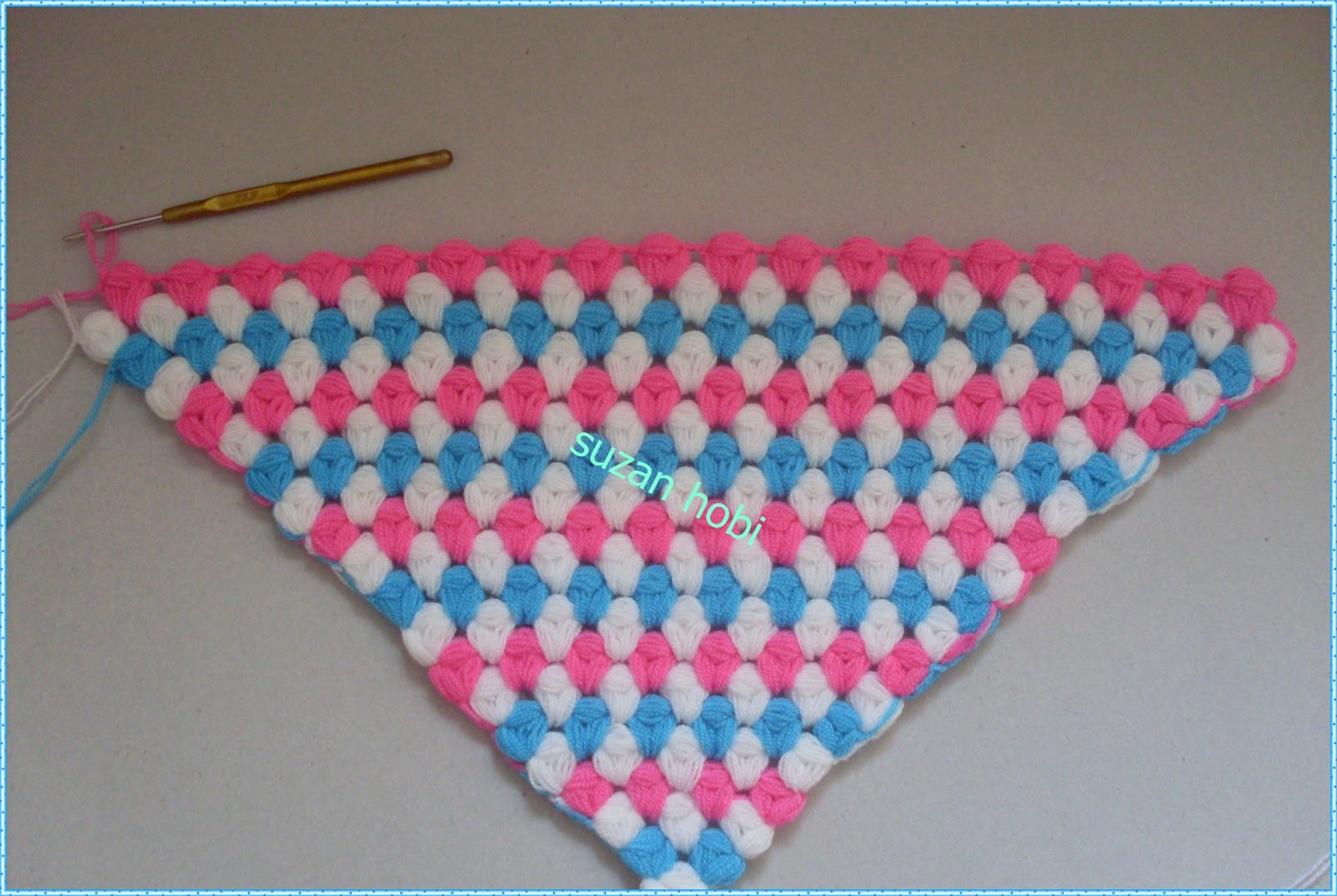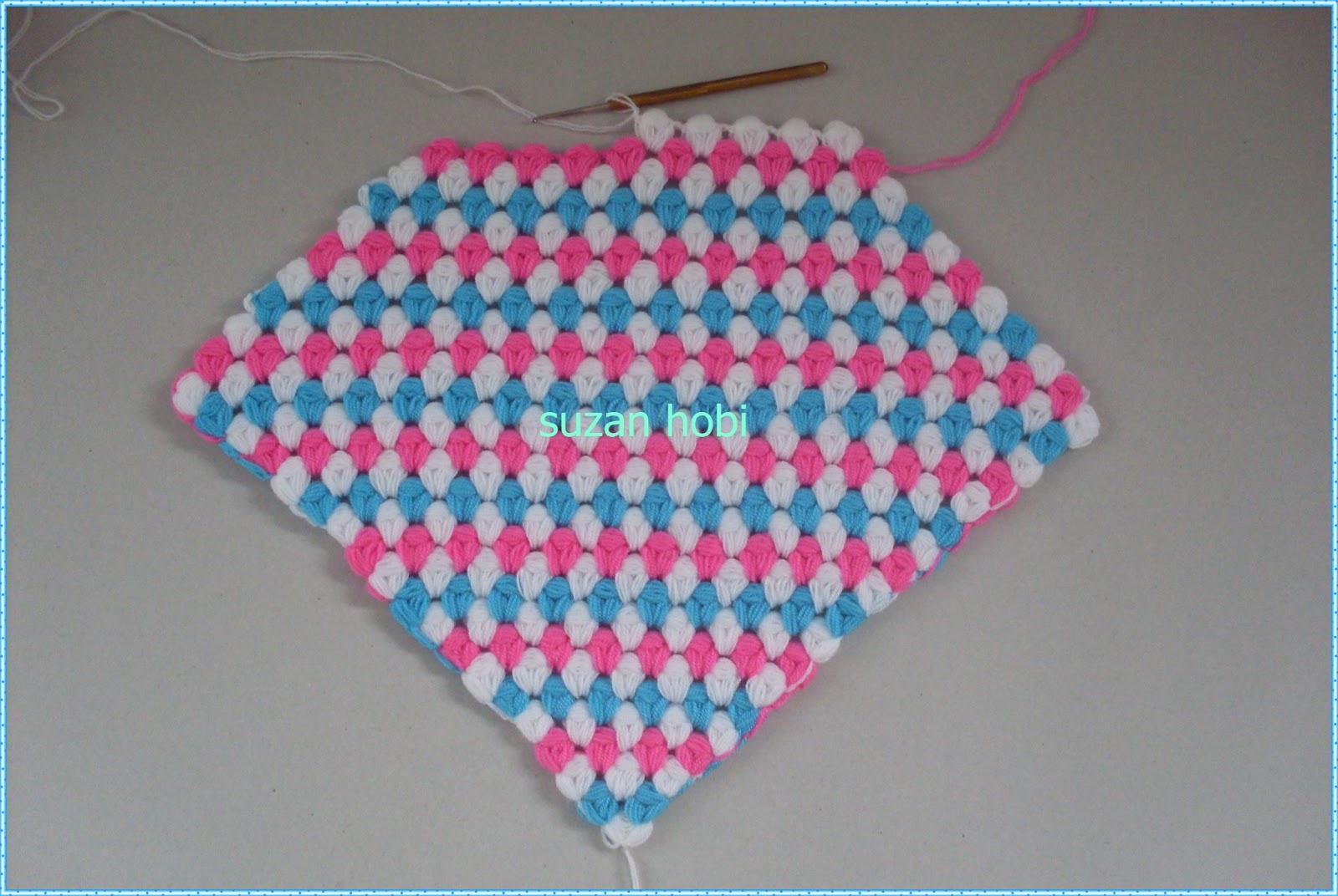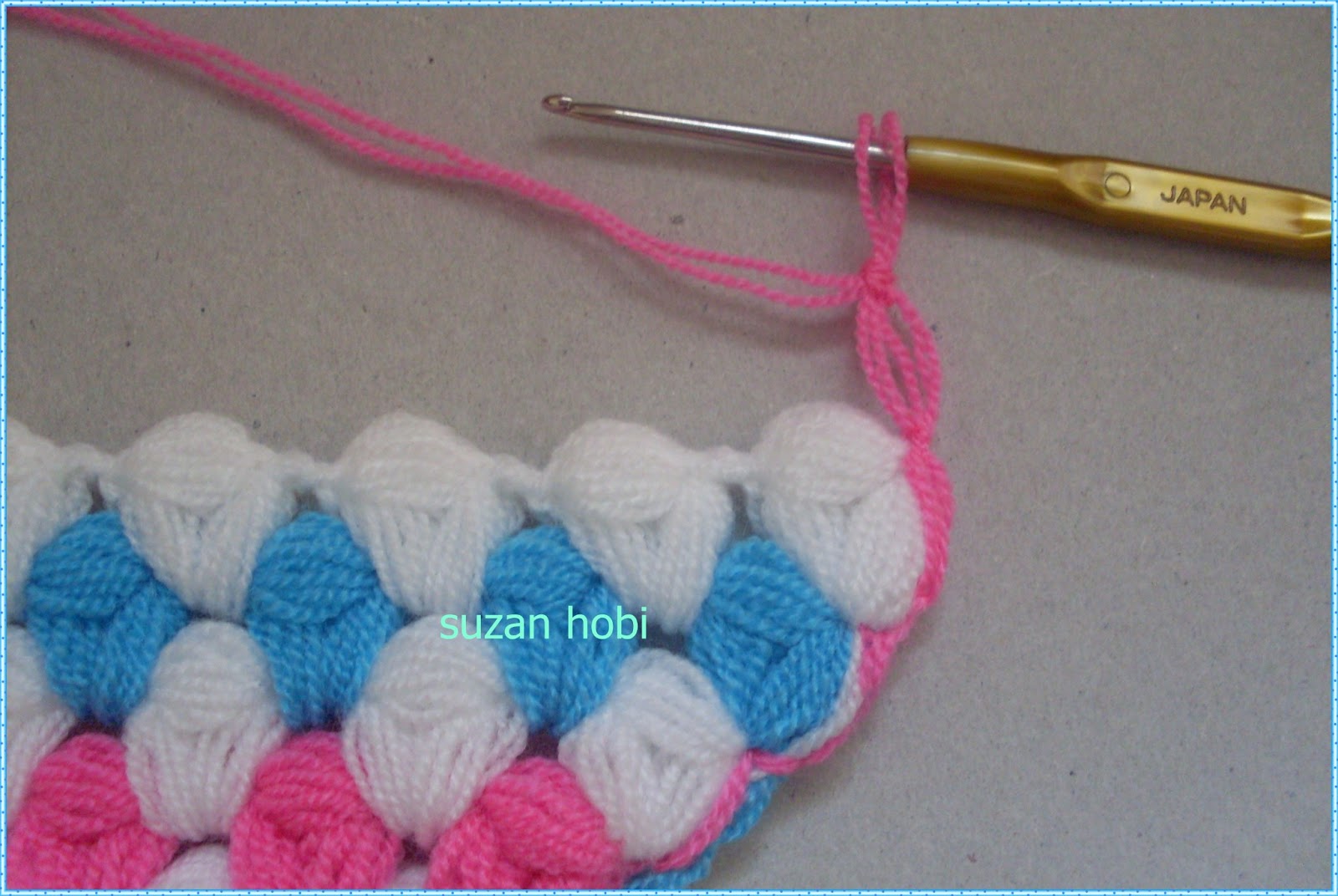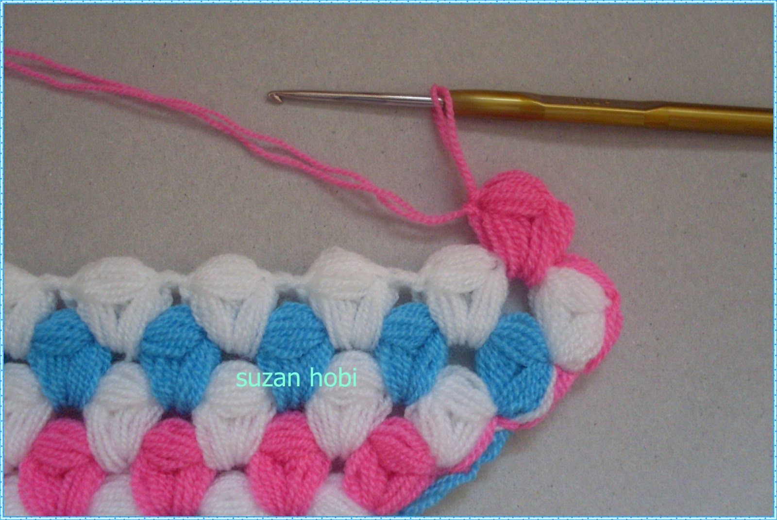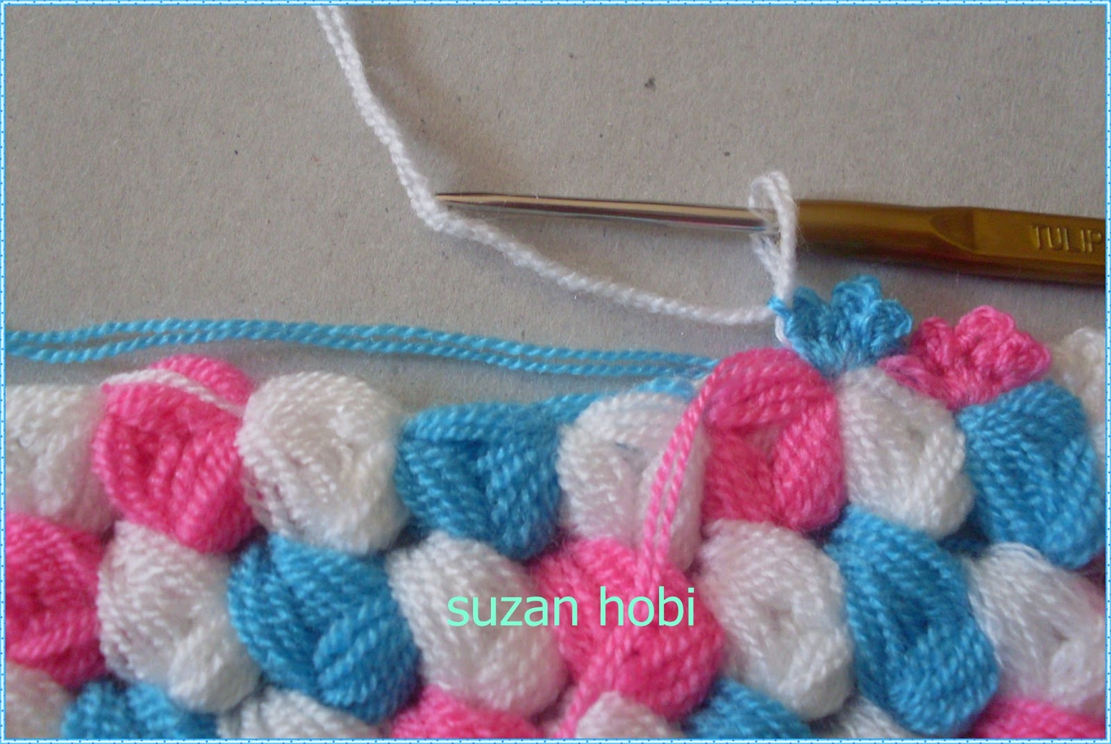 yine ok işaretiyle gösterdiğim yere tığımla girip mavi ipliği bu şekilde yukarıya