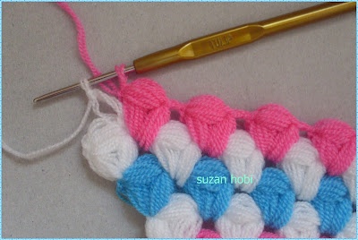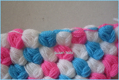 pembe ipime geçtim onu beyaz ilmeğin içinden geçirerek beyaz ipimi sıkıca çektim, pembe rengimle üç pıpırcık yaptım ,