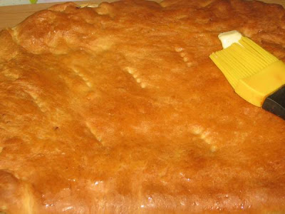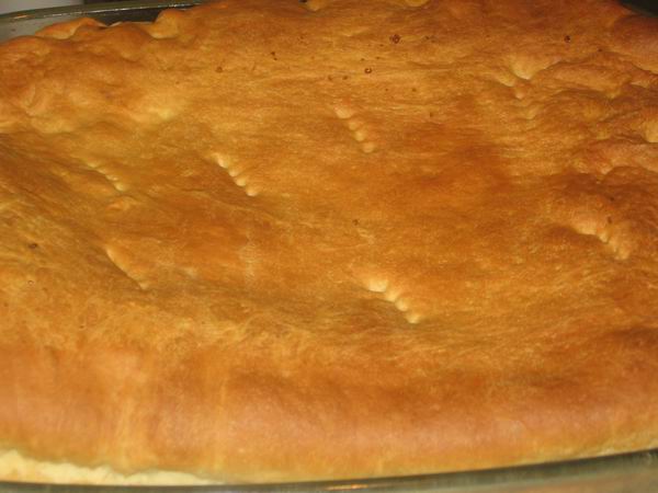 Раскатываем его в пласт, половину укладываем в противень, распределяем равномерно, чтоб появмлись бортики.