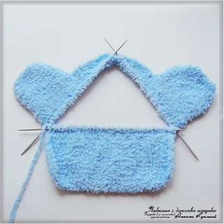 Для правого уха добираем в конце 12 ряда 12 петель, для левого уха добираем 12 петель в конце 13 ряда.