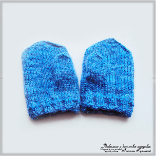 И в дополнение ещё варежки, сделанные тем же способом: отдельно верх и низ. Поскольку мотка пряжи MERINO DE LUXE/50 хватило только на шапку, верх варежек связан из ангорки с добавлением акриловой пряжи.