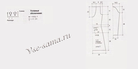 Набрать цепочку из 121 в. п. и вязать узором по схеме 2. На высоте 19 см закрыть для пройм с обеих сторон по 12 п. и продолжить вязание прямо. На общей высоте 40 см закончить вязание.