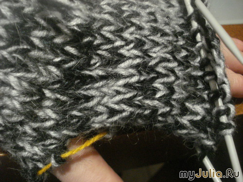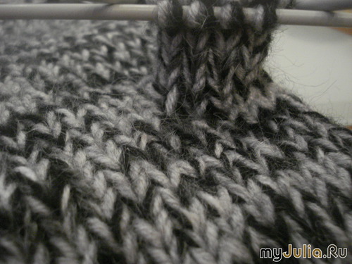 Специфика этого вязаного шарфа такова, что петли, которые провязаны английской резинкой, могут заворачиваться.
