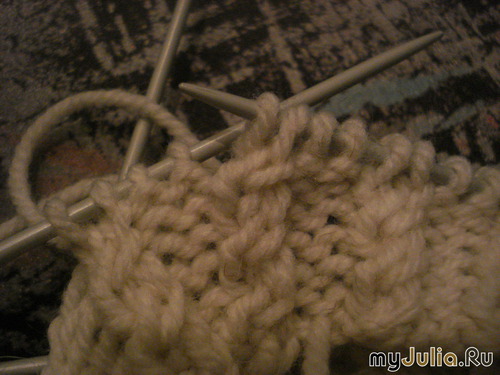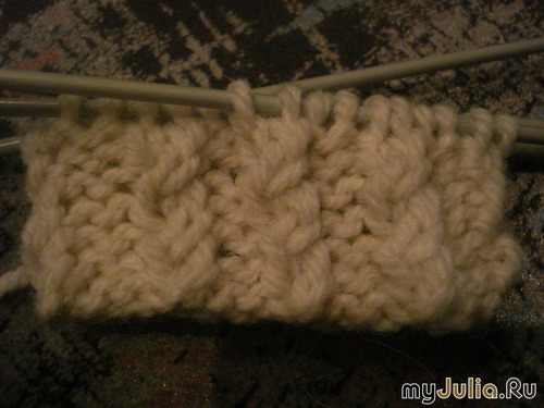 Наберите на спицы 5 миллиметров белой нитью 59 петель крестообразным набором, и распределите их след-ю образом: кром-я, 3 петли лиц-й глади, 51 петля рельеф-о узора, при этом 2 раза повторите петли раппорта, заканчивайте первыми 11 петель раппорта, 3 петли лиц-й глади, кром-я.