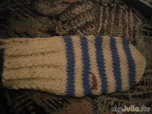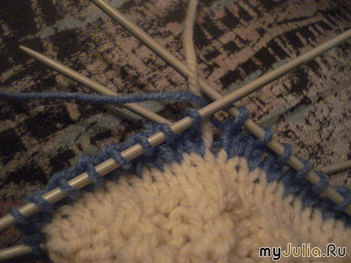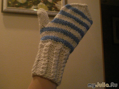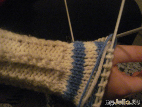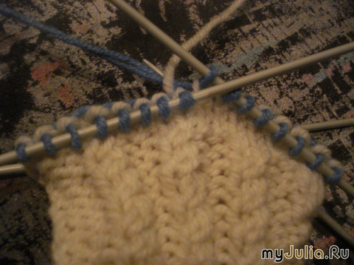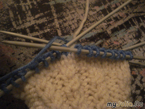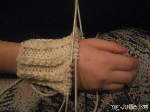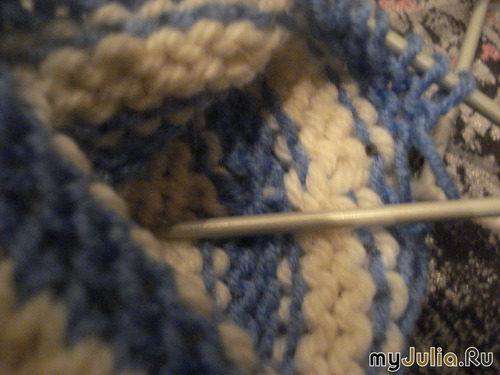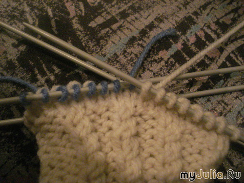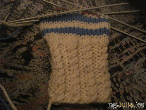 Наберите на спицы 5 миллиметров белой нитью 52 петли крестообразным набором, и свяжите 8 сантиметров резинкой. Затем петли распределить: кром-я, 41 петля рельеф-о узора, начиная с посл-х 10 петель раппорта, 1 раз выполните петли раппорта, заканчивайте первыми 11 петель раппорта, продолжите вязание 9 петелями резинки, кром-я.