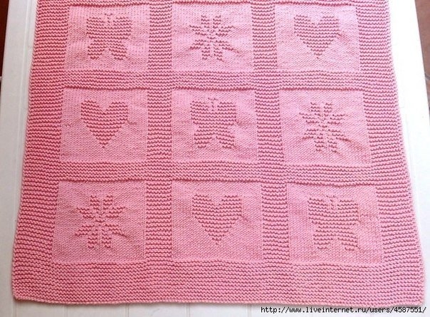 2. Сборка. Связав необходимое количество квадратов, сложите рисунок, который вам подходит и аккуратно сшейте их между собой. После сборки, одеяло необходимо обвязать. Поднимите петли по всему периметру и свяжите несколько рядов платочной вязкой. Или выберите любой другой способ обработки края.
