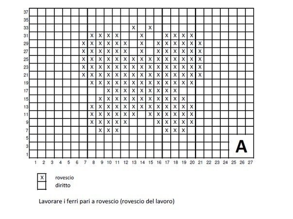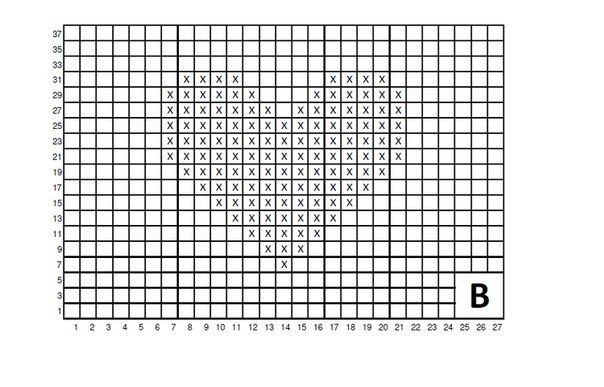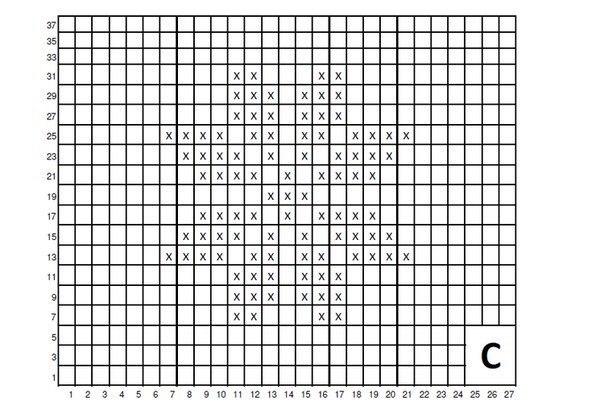 Весь рисунок нужно вязать платочной вязкой. Набираете 1 петлю цвета (А) и с каждым рядом прибавляете по 1 петле, пока их не станет 7. После этого поменяйте цвет на (В) и таким же образом увеличивайте количество петель до 21. После этого вновь вернитесь к цвету (А) и прибавляйте петли до 29 - это средина квадрата. С этого момента начинайте уменьшать количество петель по 1 в ряду. Когда дойдете до 23 - поменяйте цвет на (В), а когда станет 9 - на (А). Дойдете до 3-х - свяжите их все вместе. Квадрат готов.