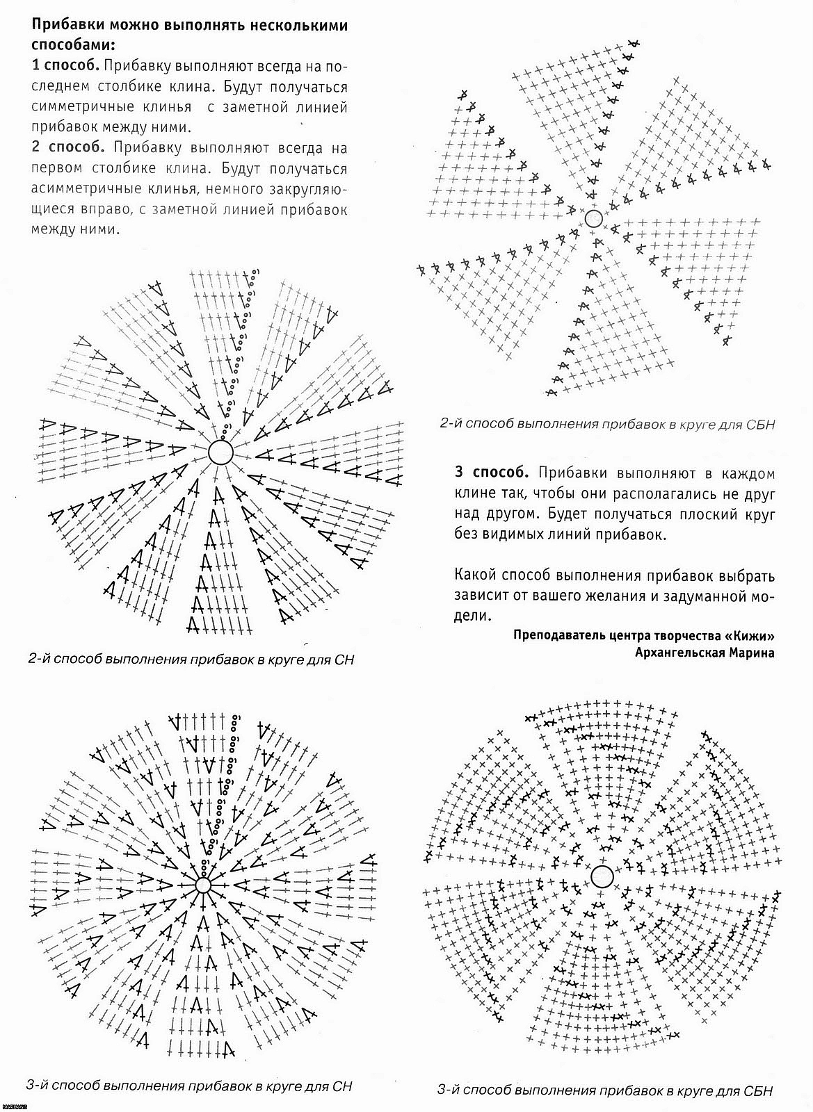 Для вязания шапочек крючком часто применяется схема вязания круга. Для СБН (столбиков без накида) – схема 1, для СН (столбиков с накидом) – схема 2.