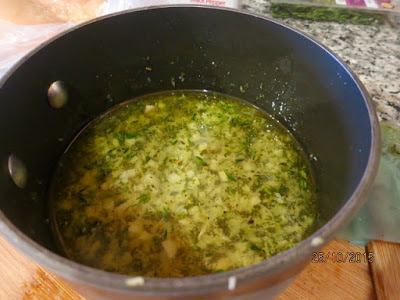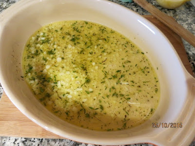 Снимаем кастрюльку с огня. Добавляем к маслу вино, лимонную цедру, сок половины лимона, нарубленные листочки тимьяна и слегка растертый пальцами сушеный орегано. Перемешиваем.