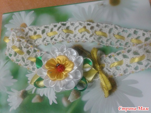 Сложилось так, что заказали мне сделать две повязочки для полугодовалых малышек. Порыскала я в галантерейных просторах родного города и пришла к выводу, что негде в нашем городе купить готовую повязку для малыша (чтоб головочка дышала и не расползлась при попытке сорвать с оной)! Пришлось вспомнить навыки вязания крючком (давно забытые ещё в школе). Связала две повязочки из х/б ниточек. Очень кстати удобно вышло, т. к. в месте где должен крепиться цветочек можно провязать основу не сеткой и тогда легко клеять-шить: ![]()