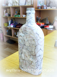 Приступаем. Берем пару страничек из глянцевого(обязательно) журнала, рвем на произвольные кусочки и обклеиваем ими бутылку.