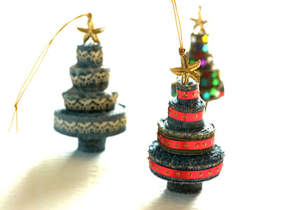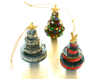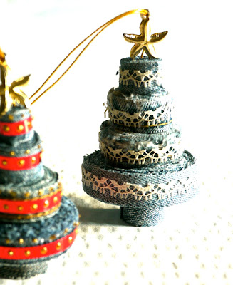 Учитывая, что у нас на носу новогодние праздники, из джинсовых колесиков можно сделать елочные украшения!