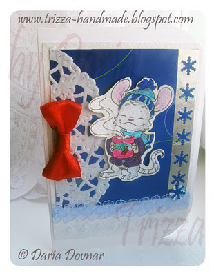 Итак, я открыла новогодний сезон открыток) Первая открытка получилась зимняя, с согревающим ярким бантиком и довольной мышкой)