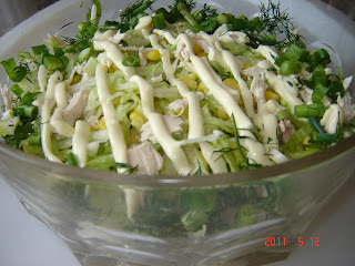 Пекинскую капусту нарезать на мелкие полосочки.Лук на кубики.С кукурузы слить сок,дать стечь лишней жидкости.
