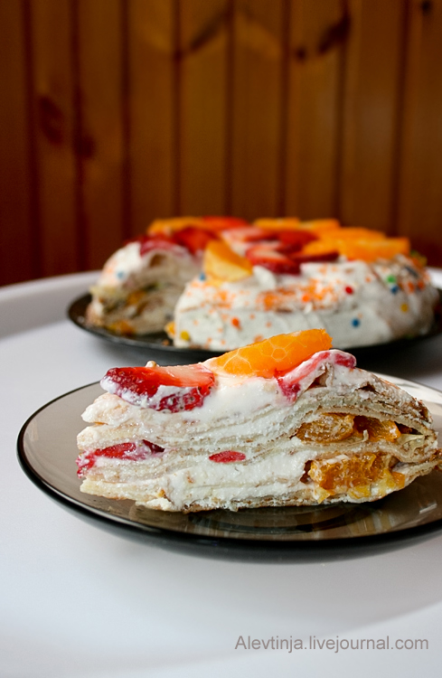 Сложить блины стопочкой, прослаивая их кремом и мандаринами (и клубникой).