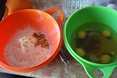 В разных мисках соединим сухие (мука, разрыхлитель, корица.сахар и цедра) и жидкие (яйца, масло, сок апельсина) ингредиенты.
