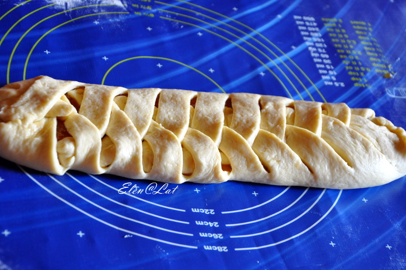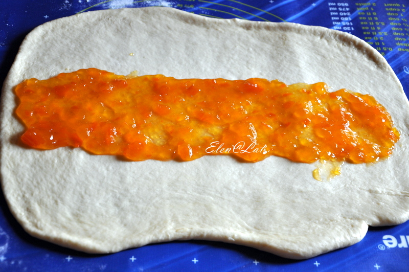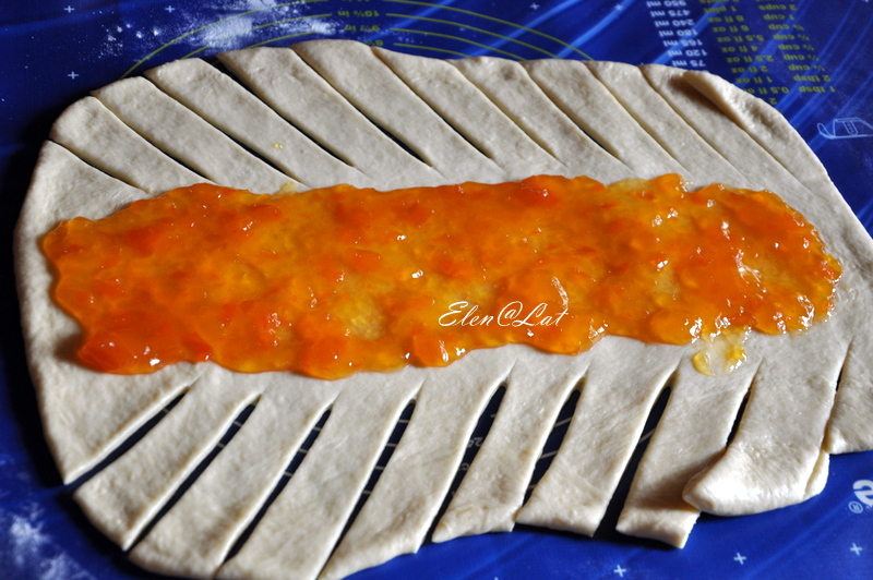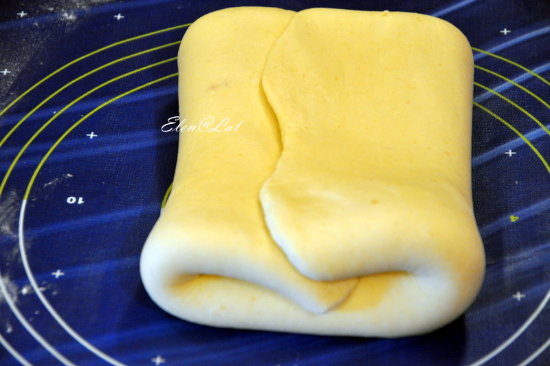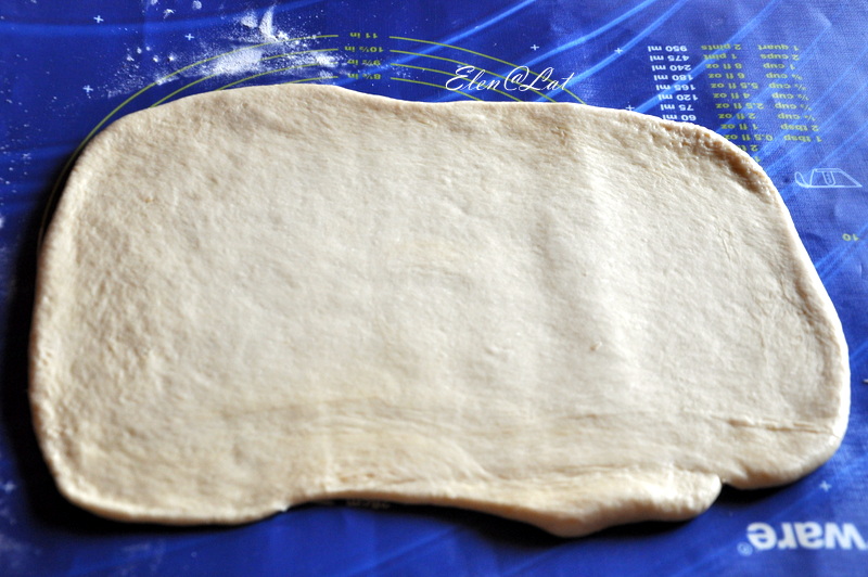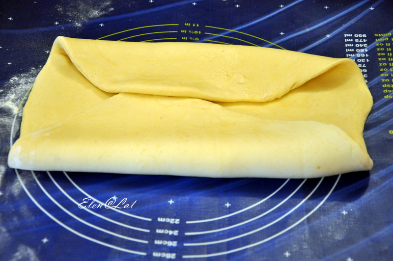 Смажьте поверхность теста растопленным сливочным маслом. Сверните две противоположные стороны так, как показано на фото: одна сторона должна ложиться внахлест на другую.