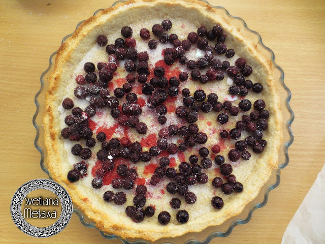 2/3 теста раскатала, уложила в форму. На дно выложила ягоды, в один плотный слой, сверху слой крема, потом ещё слой теста и вилкой прошлась по краям. Сверху смазала желтком и вилкой нанесла рисунок. Выпекала 40 минут при 200 градусах. Надо обязательно охладить перед подачей!