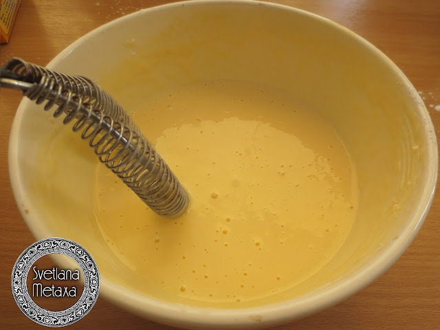 6.Приготовить заливку. В миску положить яйца, сметану, сахар, ванильный сахар, добавить крахмал и хорошо размешать венчиком до получения однородной массы.
