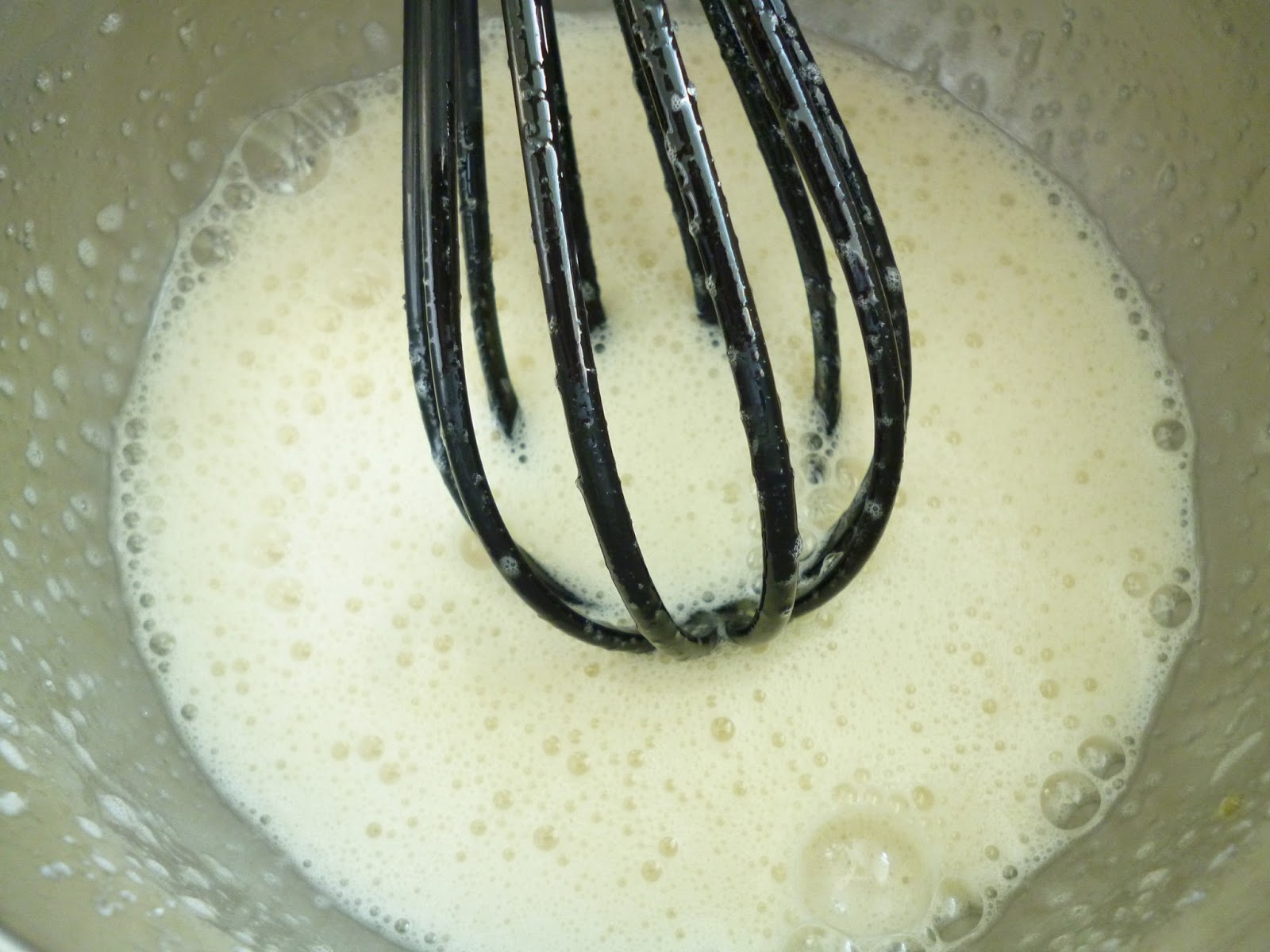 Муку смешать с разрыхлителем и добавить в миску частями в три приема, каждый раз вымешивая до получения гладкого теста.