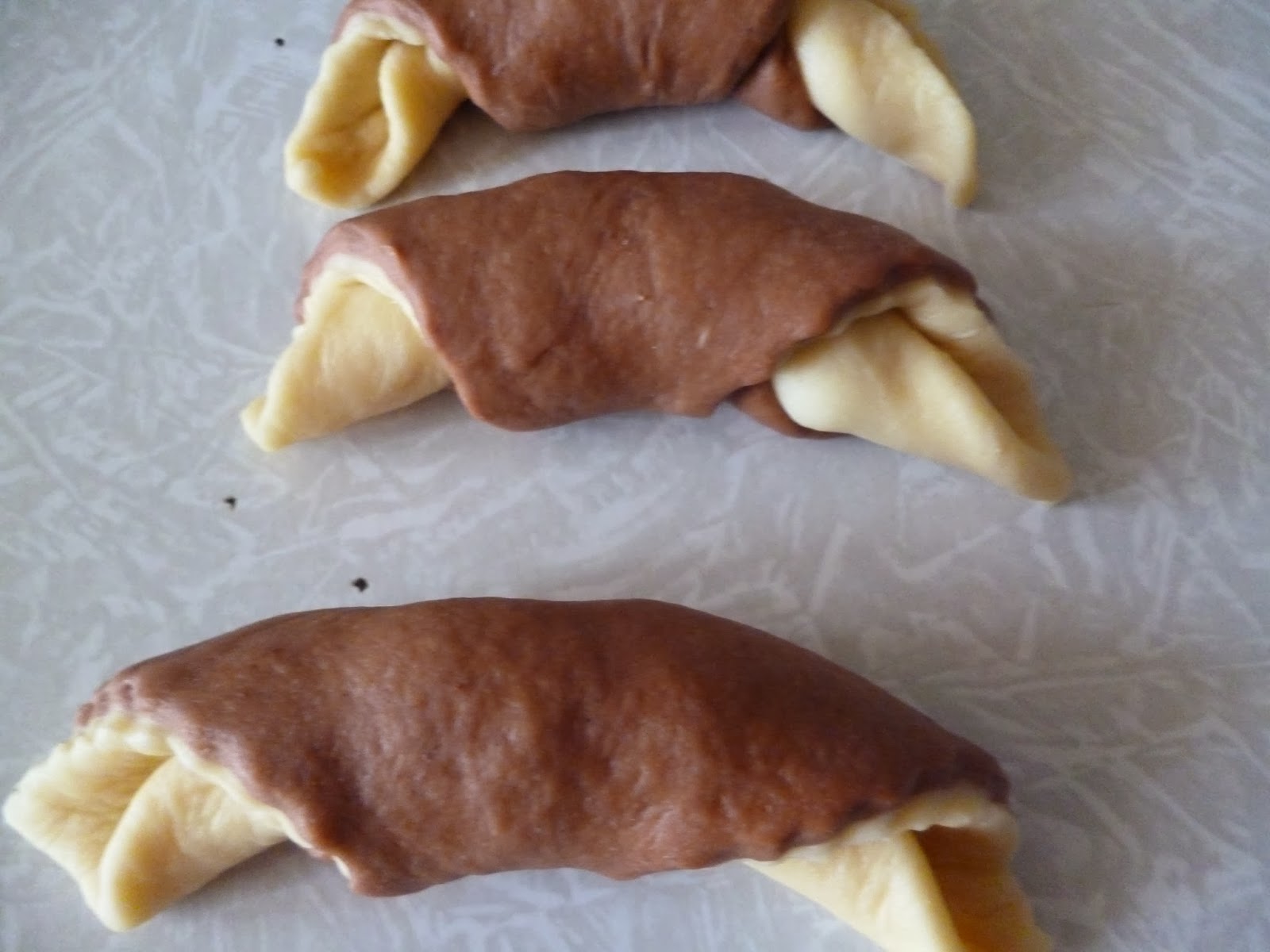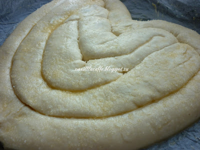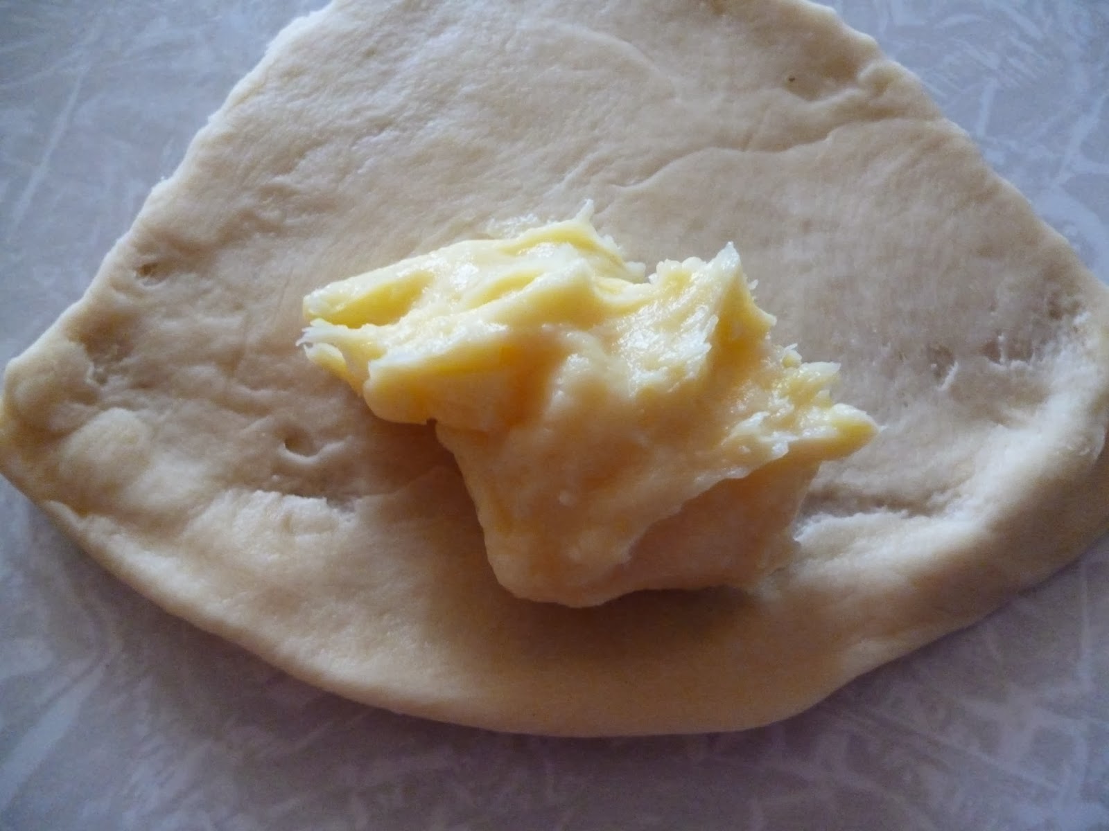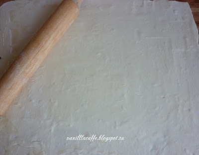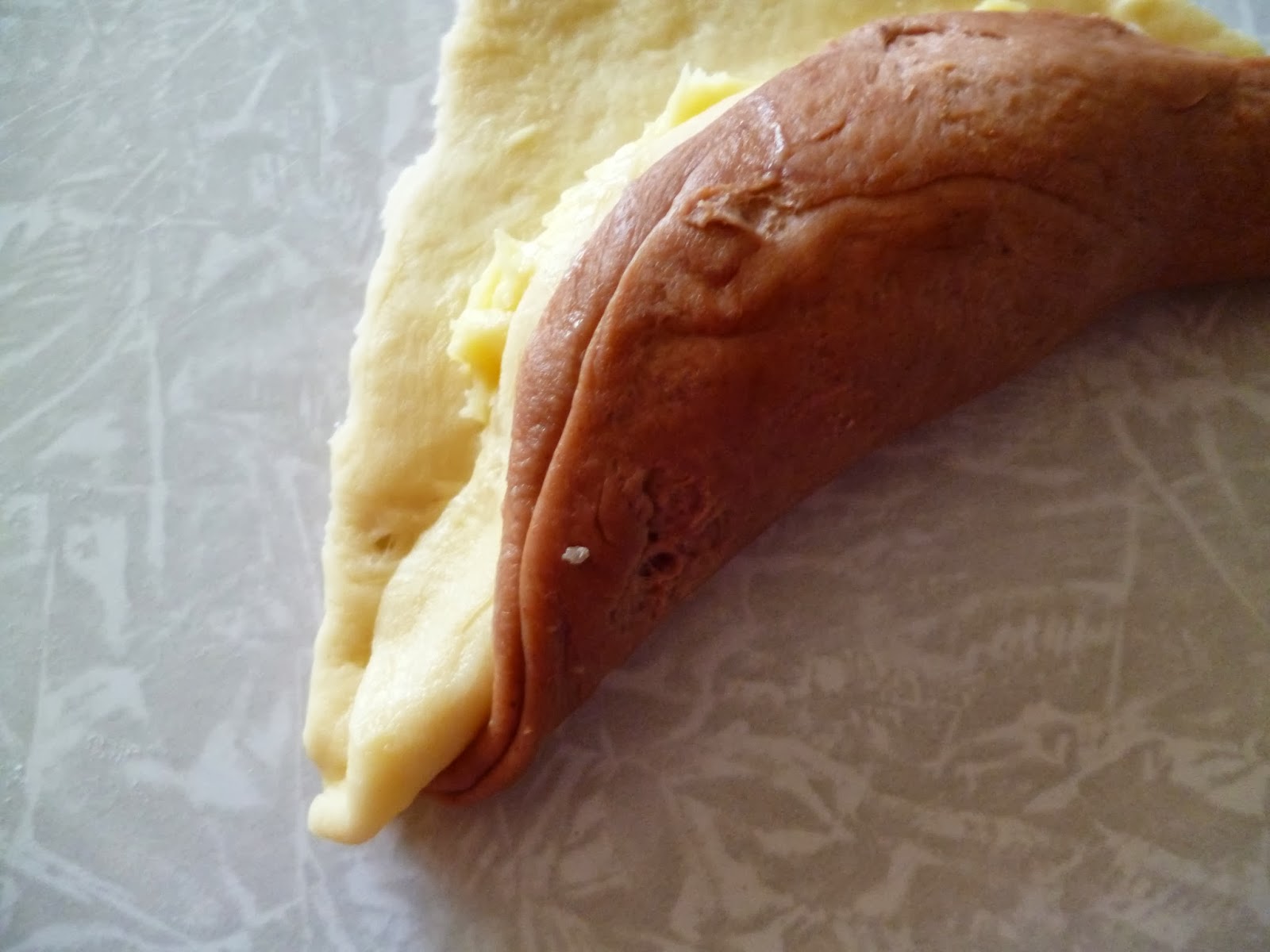 10.Берем одну часть теста и раскатываем его в прямоугольник(примерно 20 на 40 см.)Хорошо смазываем тесто растительным маслом и распределяем начинку равномерно по всей площади.Свертываем тесто не тугим рулетом(примерно на 3 свертывания),кладем швом вниз и острым ножом режем на булочки 8-10 см длиной.Укладываем на противень и даем расстояться 30-35 минут.