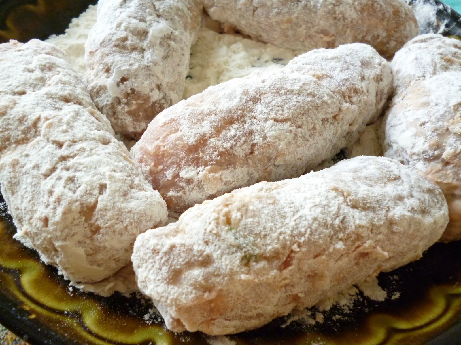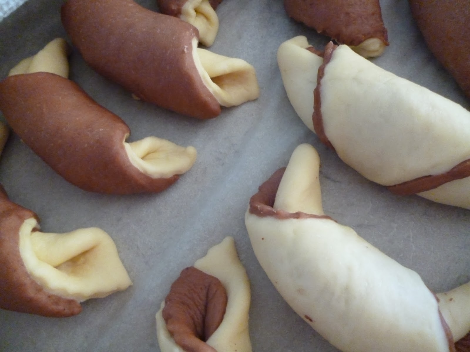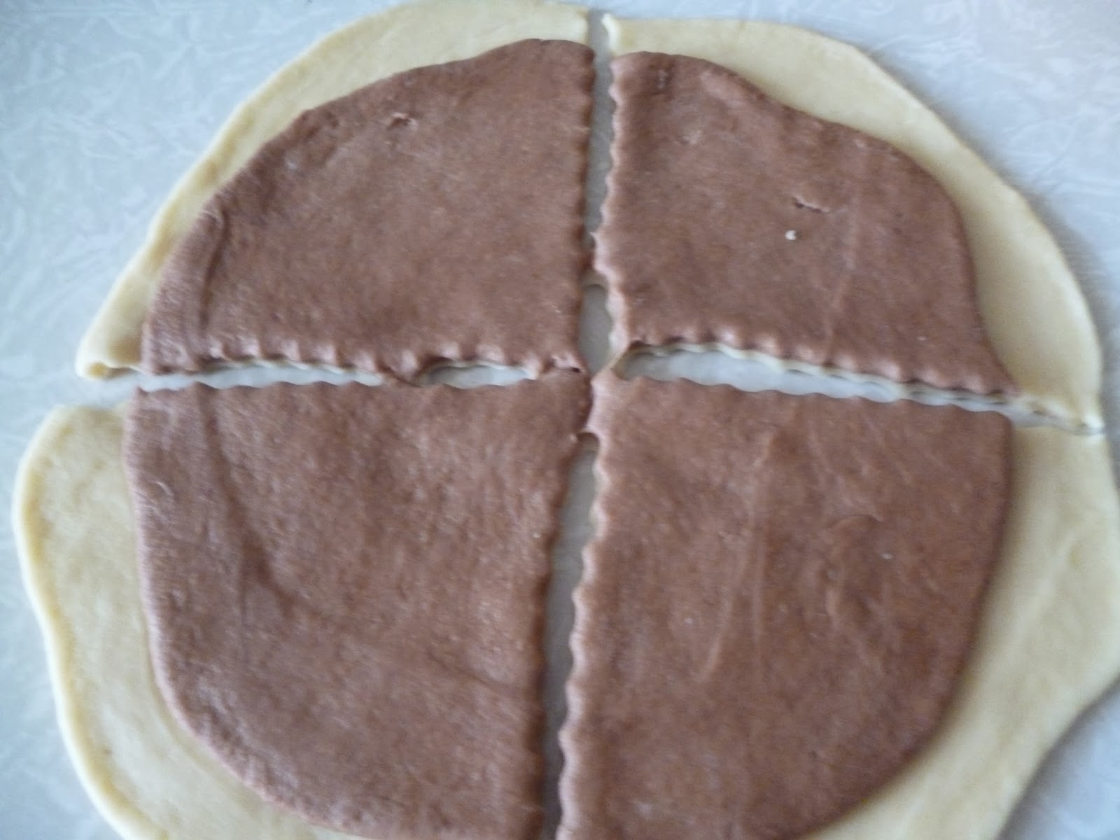 10.Берем одну часть теста и раскатываем его в прямоугольник(примерно 20 на 40 см.)Хорошо смазываем тесто растительным маслом и распределяем начинку равномерно по всей площади.Свертываем тесто не тугим рулетом(примерно на 3 свертывания),кладем швом вниз и острым ножом режем на булочки 8-10 см длиной.Укладываем на противень и даем расстояться 30-35 минут.