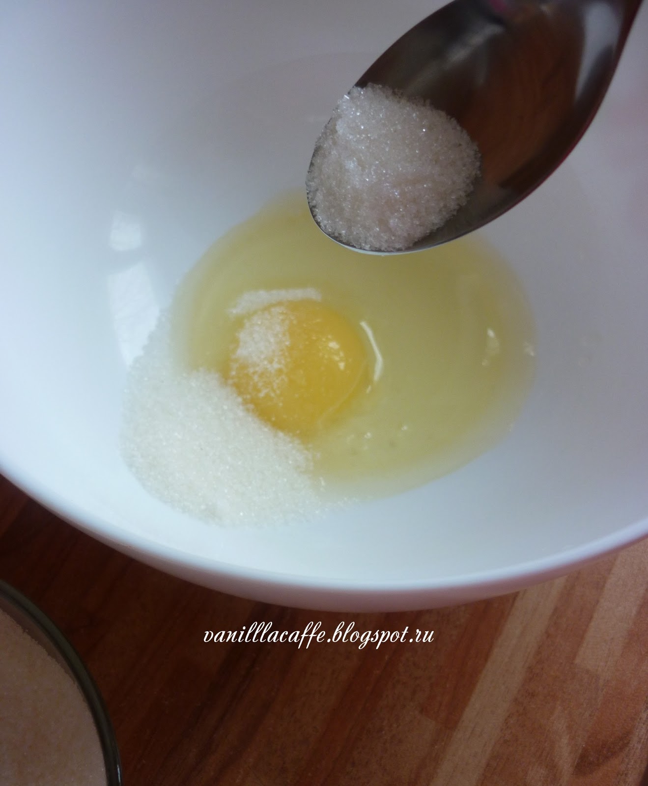 1.Начнем приготовления пирога традиционно, со взбивания двух яиц с сахаром и ванильным экстрактом , вбиваем до пышности и посветления , но полного растворения сахара не будет. Две столовые ложки сахара от общего количества отсыпаем в миску, он используется для посыпки.