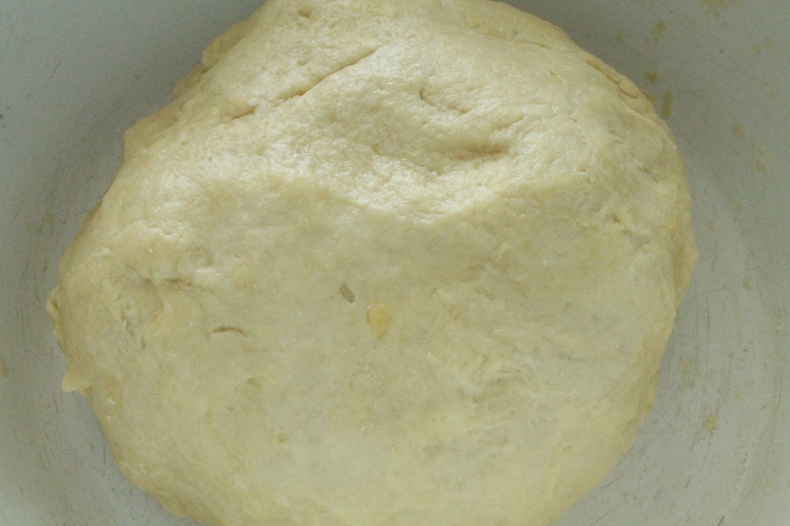6.Постепенно добавляем остальную муку и теплый маргарин и вымешиваем тесто ,чтобы оно начало отставать от рук и стенок посуды.