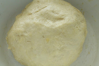9.Тесто перекладываем на стол,посыпанный мукой и делим его на 5-6 шаров.Накрыть полотенцем.Начинку тоже делим на столько же частей.