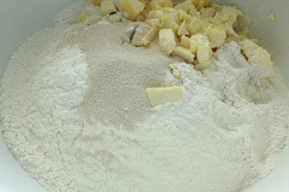 Муку просеять, добавить пакетик сухих дрожжей, щепоть соли и нарезанный кубиками охлажденный маргарин. Перетереть до состояния крошки.
