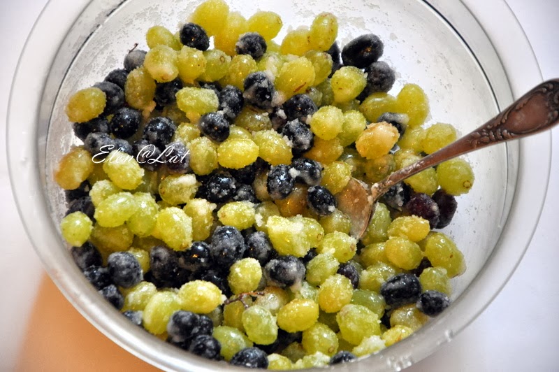 Виноград очистить от веточек, промыть и смешать с сахаром и растопленным сливочным маслом.