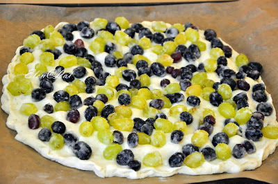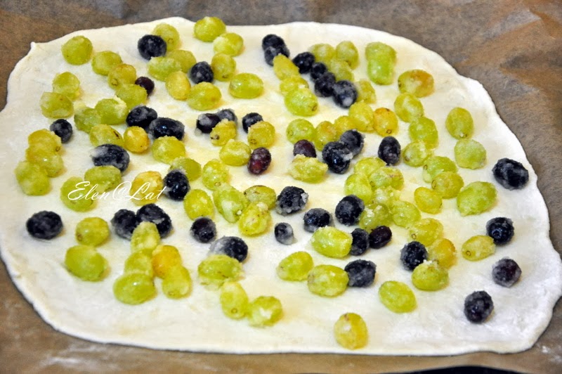 Вторую часть теста также раскатать и накрыть ей тесто с виноградом. Края защипать.