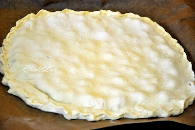 Тесто разделить на две равные части и одну раскатать, достаточно тонко. Поместить пласт на противень, застеленный пергаментом.