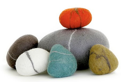 да-да-да,всё это свалянные из шерсти камушки,по-моему,это просто прекрасное дизайнерское решение!Жалко только,что никто так и не поделился методикой работы,хотя понятно,что при выполнении больших камней действует принцип наволочки,сваленной мокрым способом, а внутри этих гигантов просто наполнитель.Что касается маленьких камней,из которых потом сотавляются коврики-подушки и т.п,то думаю,что моя технология изготовления очень близка к истине)