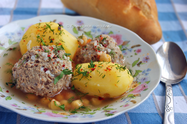 <a href="https://www.liveinternet.ru/users/v_i_k_e_n_t_i_a/post287429297/">Кюфтя-бозбаш (суп)</a><br/> Кюфтя-бозбаш - одна из разновидностей азербайджанских супов. Фарш понадобится как на тефтели (500 г говяжьего фарша, сырой промытый рис, лук, соль, перец). Картошку, штук 8, почистить и не резать. И еще нужен нут. Есть готовый консервированный. Я с ним готовила. Если такого у вас нет, то замочите на ночь сырой нут, а утром отварите его до полуготовности. В 3-литровую кастрюлю налить воды примерно половину (в зависимости от того, какой густоты вы хотите суп), пусть закипает... И фарша сделать большие тефтельки. Еще внутрь каждой тефтельки кладут одну су... <a href="https://www.liveinternet.ru/users/v_i_k_e_n_t_i_a/post287429297/">Читать далее...</a>