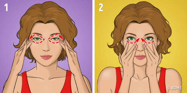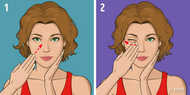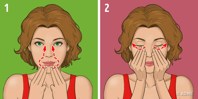 Надавите тремя пальцами по двум сторонам от носа (рис. 1). Проведите по скулам в сторону висков (рис. 2)