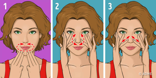 Надавите подушечками средних пальцев около крыльев носа и проведите полукруги к спинке носа и обратно (рис. 2).