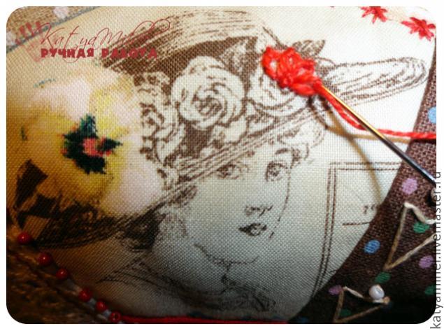 отрез любой плотной ткани, ворох лоскутков, ленты.