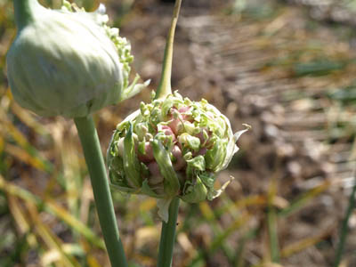 Чтобы чеснок не вырождался из года в год и не болел, я ежегодно часть посадок делаю не зубками, выросшими в земле, а воздушными бульбочками. Для этих целей оставляю пару стрелок на развод. Кстати, они служат сигналом к уборке головок: когда оболочки на стрелках лопаются, это означает, что головки в почве созрели и их пора выкапывать.