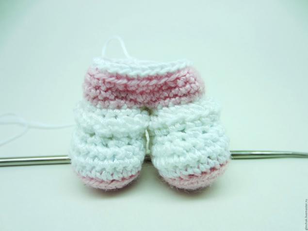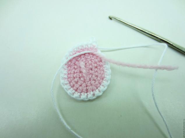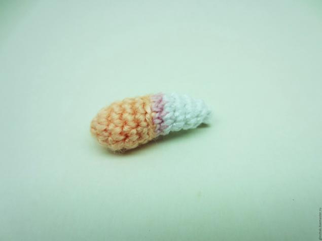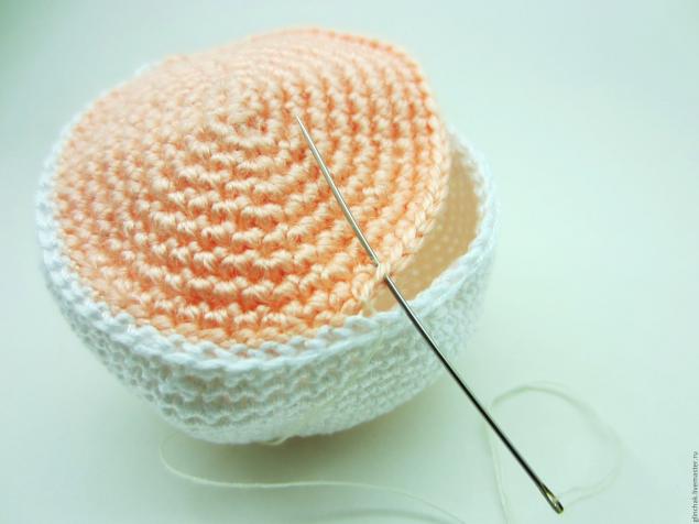 Провязав первый ряд нитью нового цвета, кончики нитей на стыке цветов необходимо завязать на крепкий двойной узел, это не позволит детали расползаться при наполнении и сгладит переход цвета.