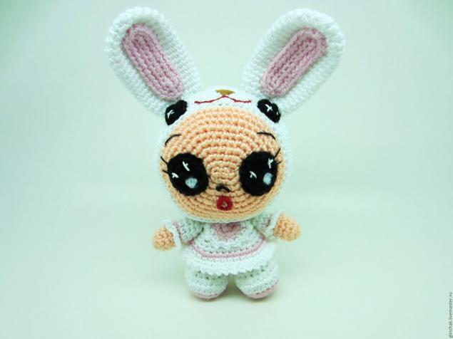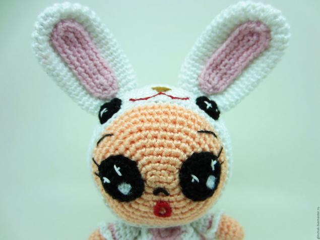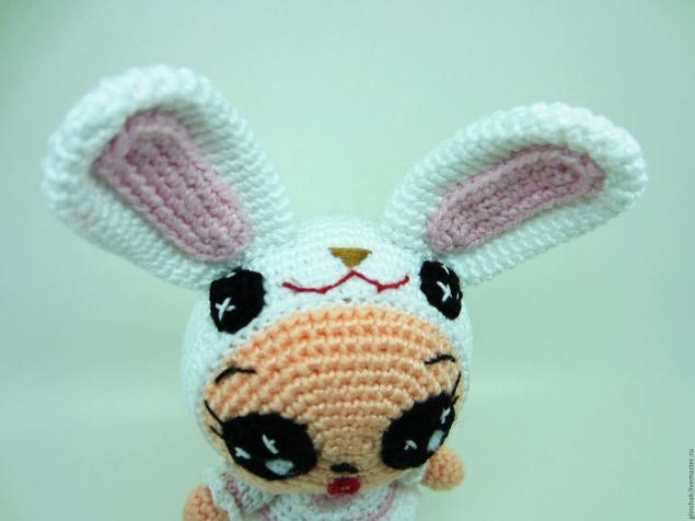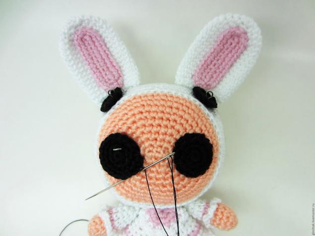 Глазки куклы и зайчика пришить тонкими швейными нитками черного цвета.