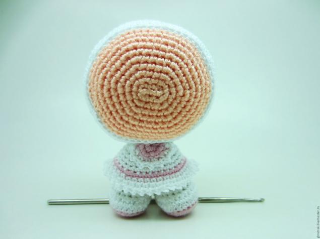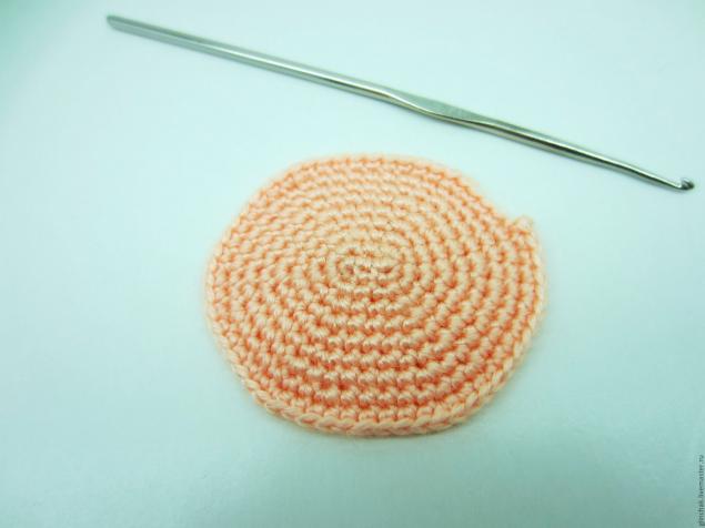 Начинаем вязание от шеи туловища, по направлению к ножкам. Первый ряд вяжем за переднюю стенку петли