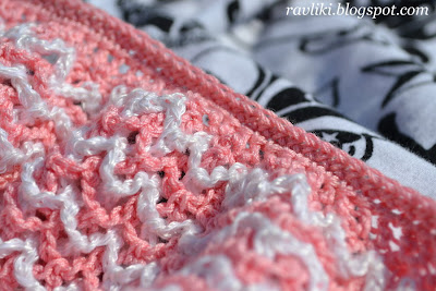 Пояс я обвязала 1 рядом столбиков с накидом и 2 рядами столбиков без накида. В последние два ряда я ввязывала шляпную резинку. Розовая нить-обвязка не обрывалась, а вот резинка - да, она проложена в двух рядах и закреплена отдельно, в целях безопасности, если одна вдруг лопнет, вторая, надеюсь, подстрахует :)