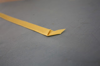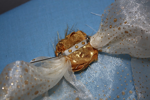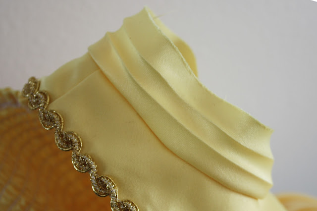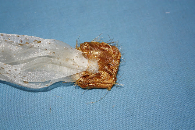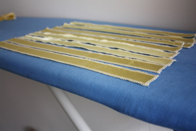 Теперь - взять кусок декоративной ткани (я использовал блестящий золото), чтобы драпировать по одежде. Я использовал 9-дюймовую полоску на около 38 см в длину. Убедитесь, что это много достаточно долго, чтобы сделать его по одежде.