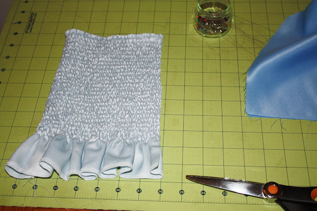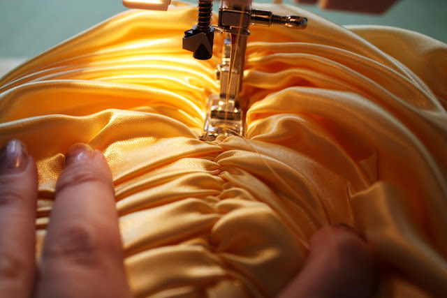 Сшейте юбку и лиф с прямой строчки прямо на вершине упругая. Когда вы доберетесь до гофрированных секций, либо переключиться на зигзагообразной строчкой, или убедиться, что протянуть упругая, как вы идете.