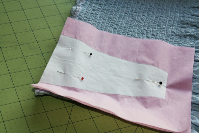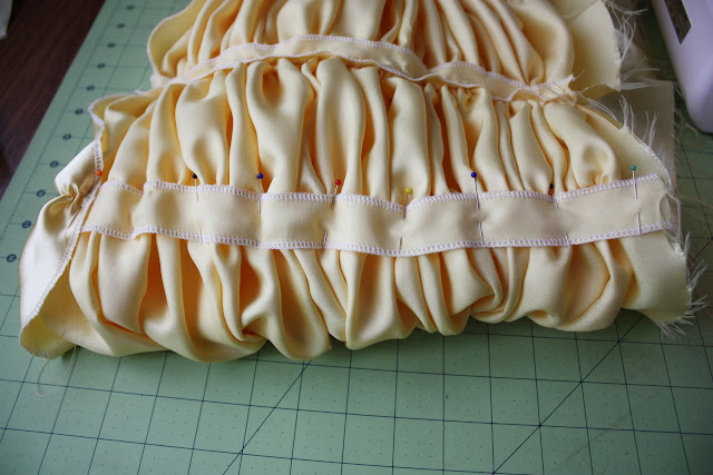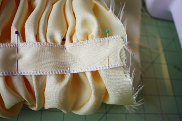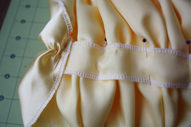 С швом вниз, собрать (вручную или использовать вашу машину) полосу в самом центре, пока это не около 1-2 см в ширину. Pin о 1/3 часть пути вниз юбку на верхней части передней центра сбора и сшить на место.