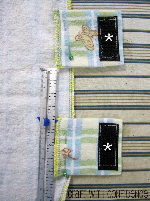 Turn the fabric right side face up and place the two 7″ Velcro pieces side by side, overlapping in the center, to create a large piece. Measure 2 1/2″ from the top and 8″ from the right edge.