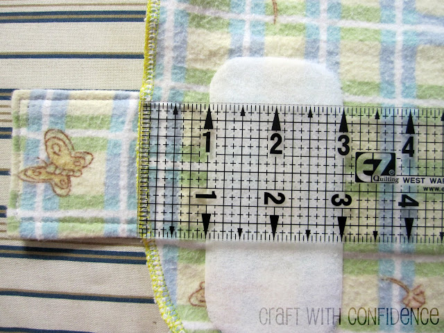 With the wrong side facing up, find the center of the right short side. Measure 1″ up and down from there and place the small straps (2″ gap between the straps).